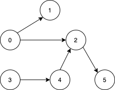 输入:n = 6, edges = [[0,1],[0,2],[2,5],[3,4],[4,2]] 输出:[0,3] 解释:从单个节点出发无法到达所有节点。从 0 出发我们可以到达 [0,1,2,5] 。从 3 出发我们可以到达 [3,4,2,5] 。所以我们输出 [0,3] 。 示例 2:
