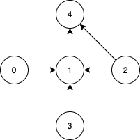 输入:n = 5, edges = [[0,1],[2,1],[3,1],[1,4],[2,4]] 输出:[0,2,3] 解释:注意到节点 0,3 和 2 无法从其他节点到达,所以我们必须将它们包含在结果点集中,这些点都能到达节点 1 和 4 。