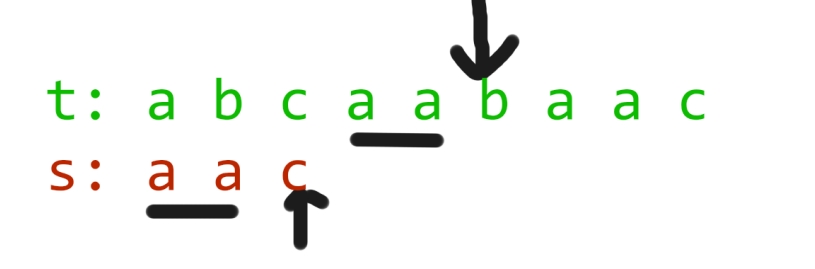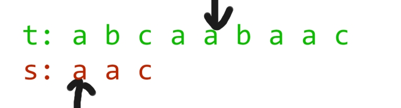 实际上,对于串s中的第一个字符,我们只需要贪心地寻找串t中第一个和它相同的字符即可,它的位置记为i。对于串s中的第二个字符,我们也只需要贪心地寻找串t中i之后的第一个和它相同的字符即可,以此类推。